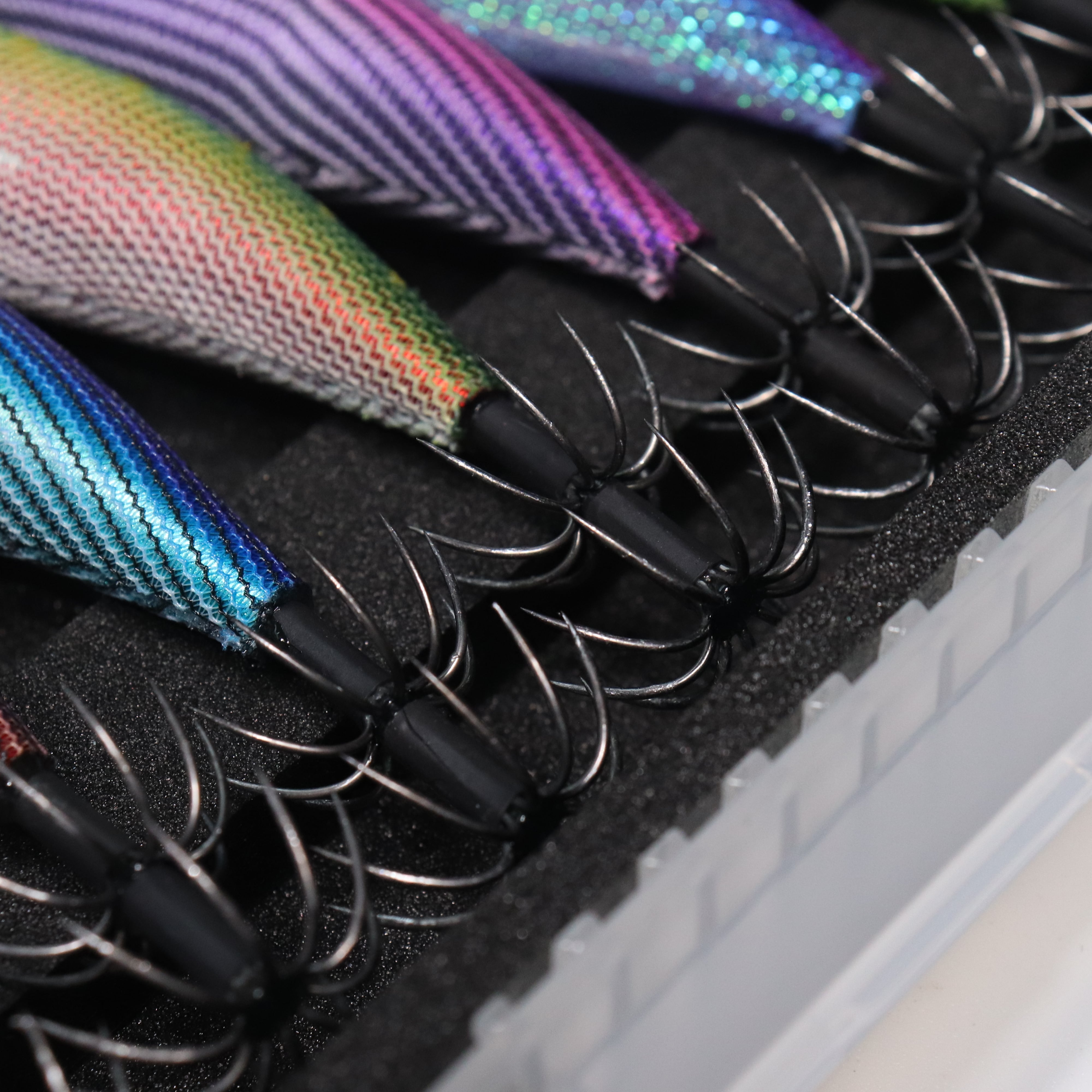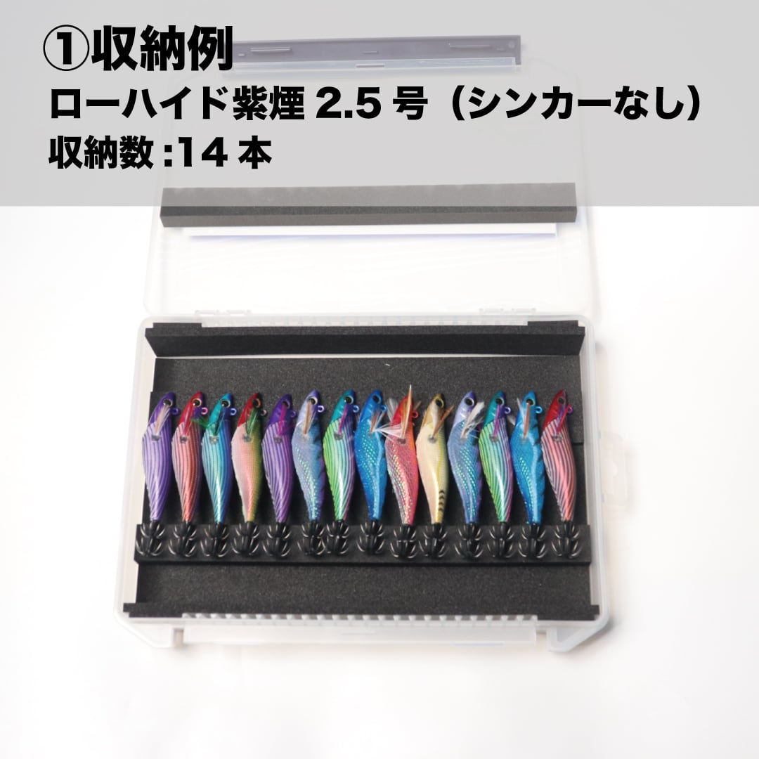 • フタを閉めた際に、エギのボディを優しく押さえ込む役割を担います。輸送中や移動中の振動によるエギのガタつきや衝撃を緩和し、キズを防ぎながら収納状態を保持します。