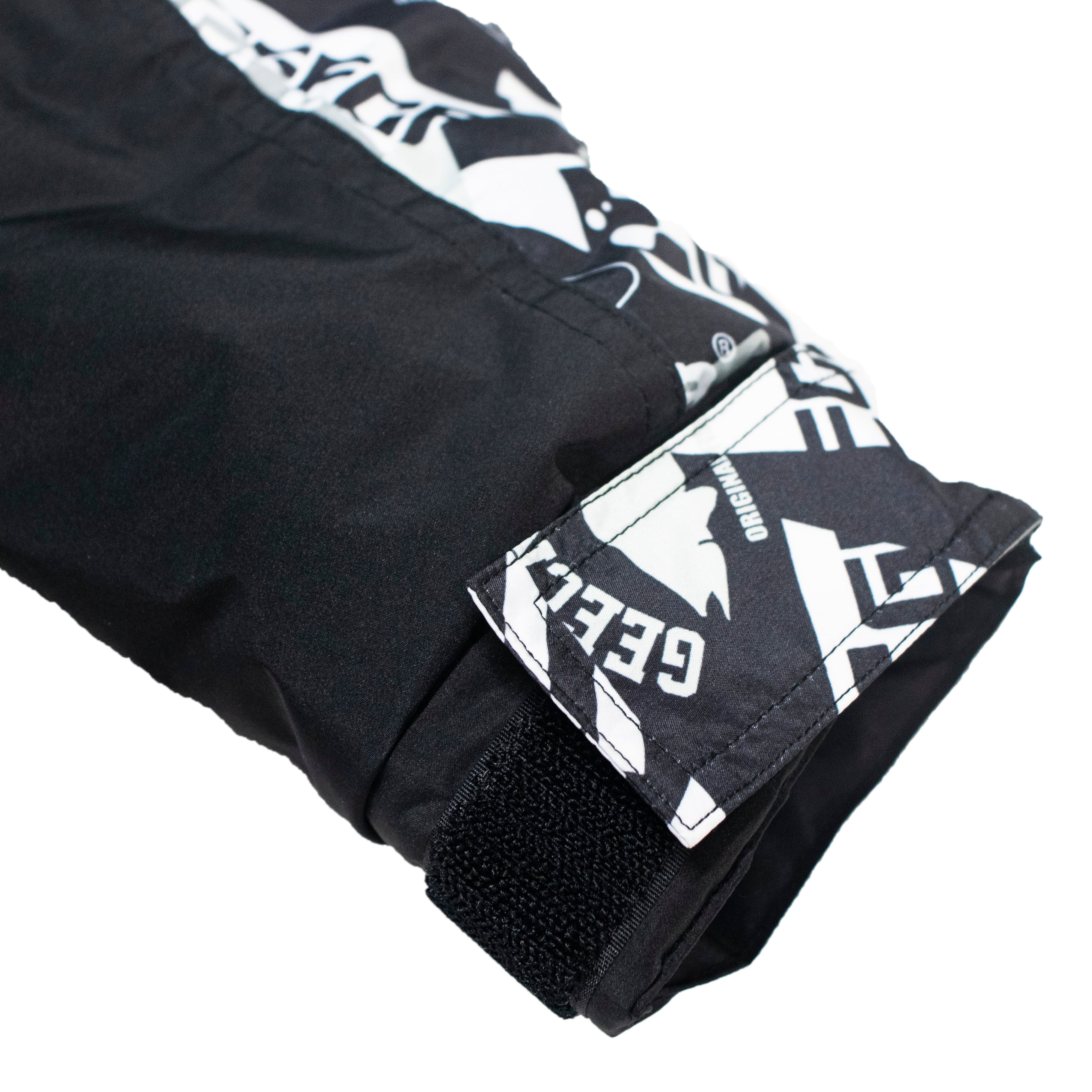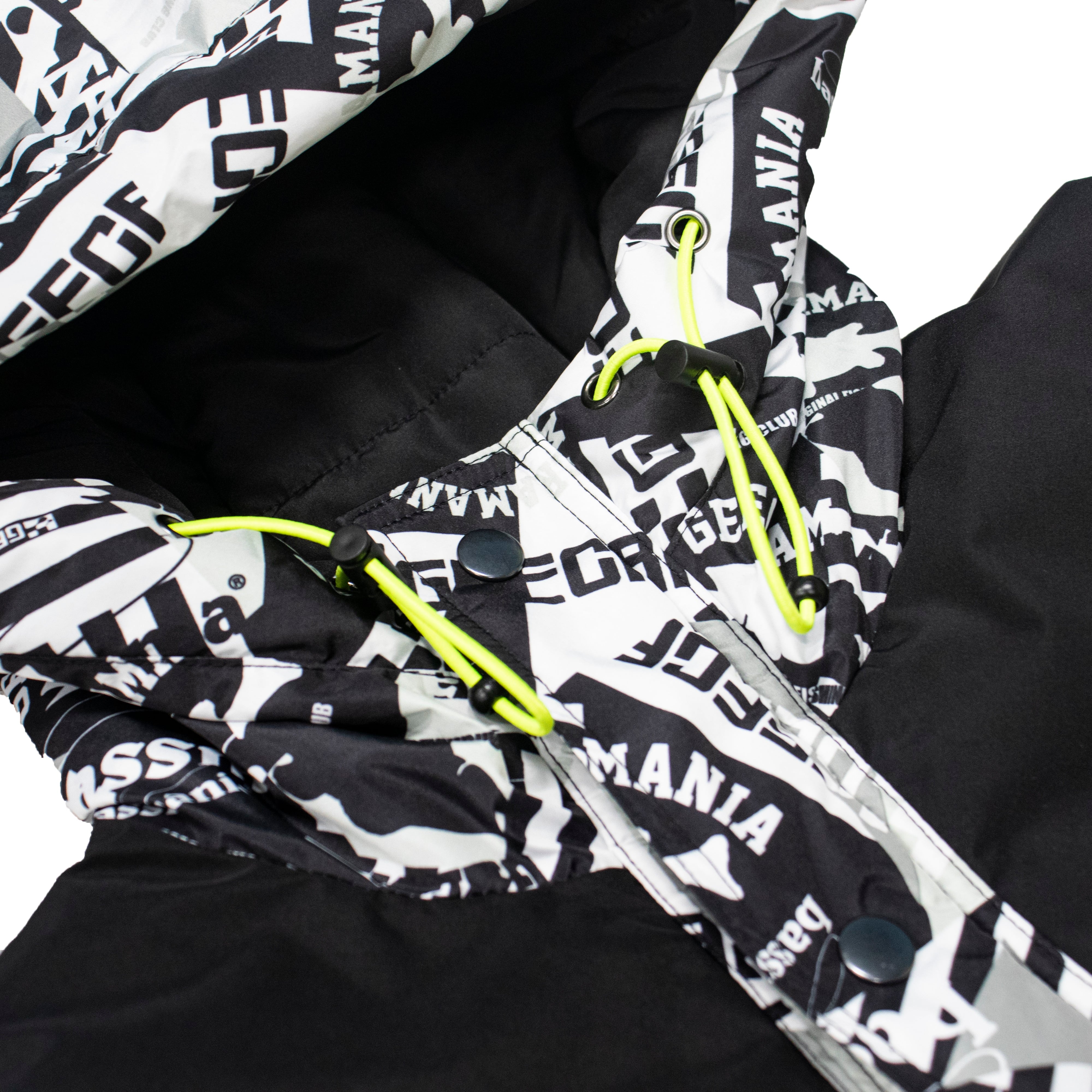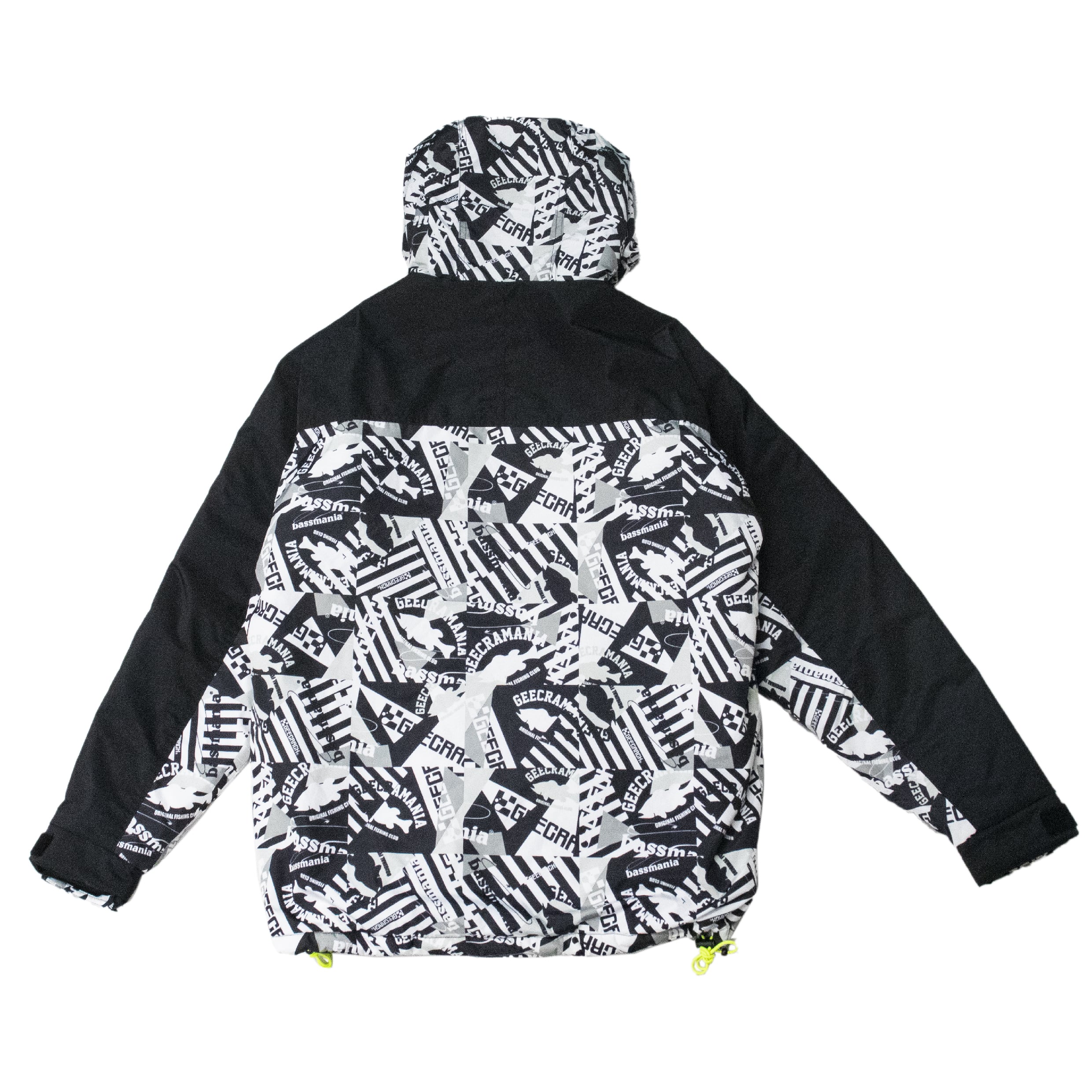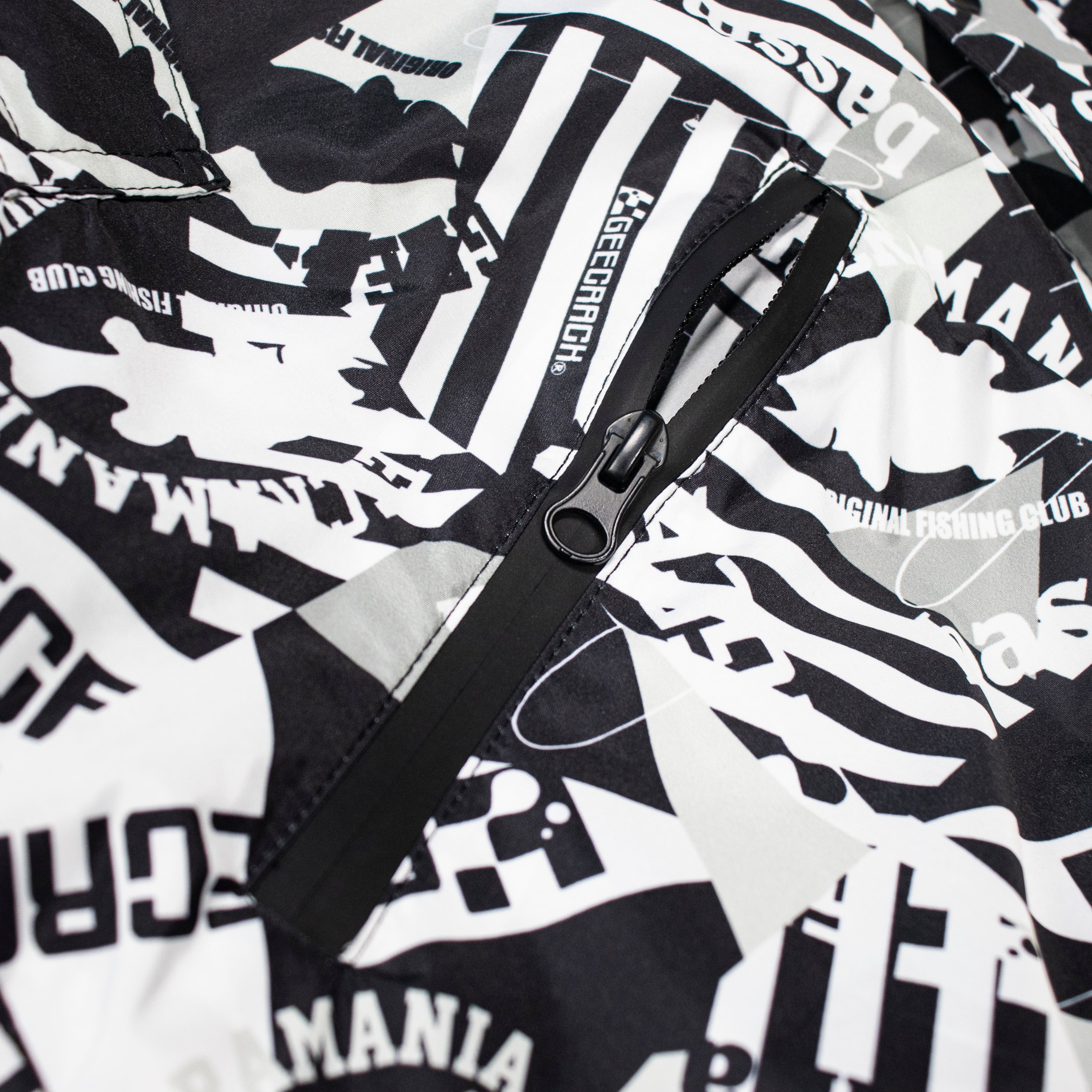 コラボデザインであるジークラマニアのMIX柄を取り入れたデザインに。首元のドローコード、裾部分のアジャスタードローコードには、アクセントカラーとなるネオンイエローをチョイス。遊び心を感じる総柄でありながらモノトーン配色にしたことで、落ち着きを感じるデザインと仕上がっております。